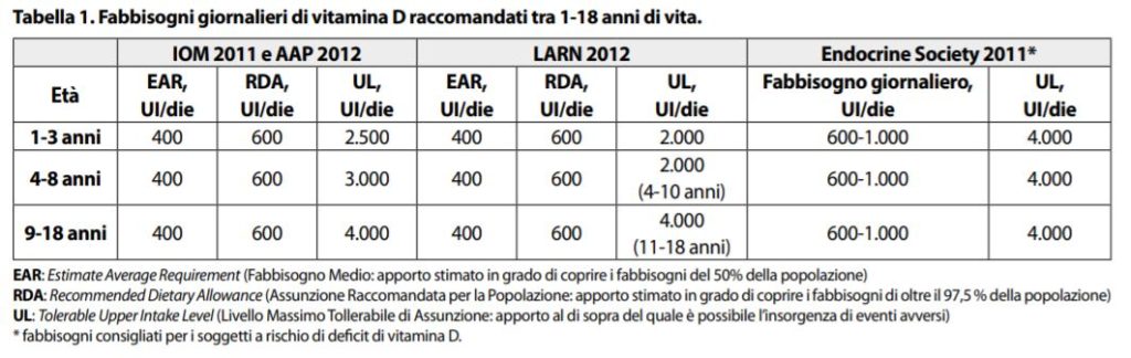 Nella tabella riportata qui sotto trovate uno schema del fabbisogno giornaliero di vitamina D raccomandato per bambini e ragazzi da 1 a 18 anni d’età.